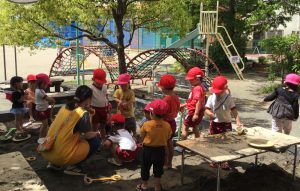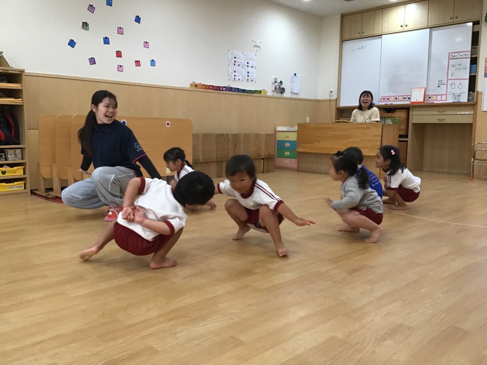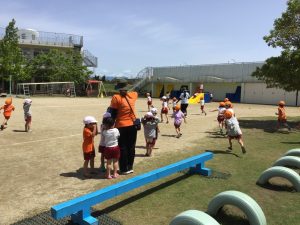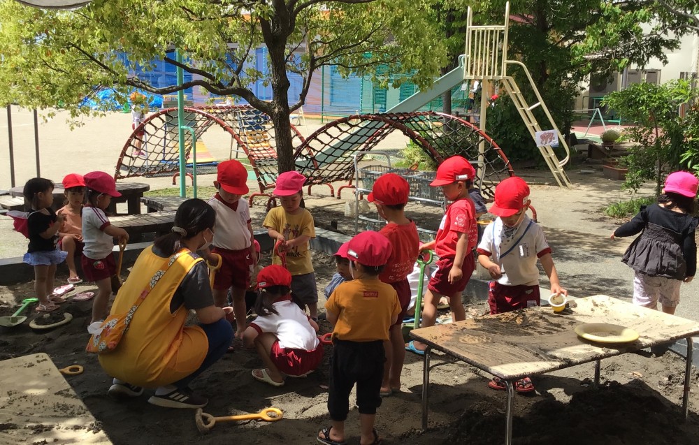 年中れんげ組は、「園庭を楽しもう」をテーマに鬼ごっこやクローバー積みを楽しんだり、砂場では保育園部2歳児のつぼみ組さんに優しく声をかけながら遊んでくれていました。