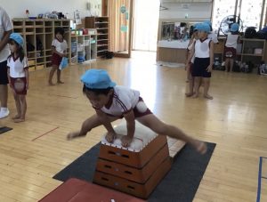ひまわりさんは跳び箱で、初めて3段の縦に挑戦!