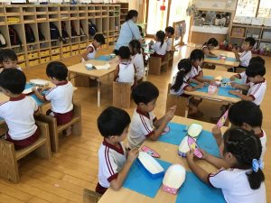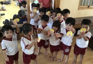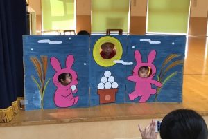 皆でお月見のダンスを踊ったり、パネルシアターを見た後、顔はめパネルで写真を撮ったりして楽しみました!
