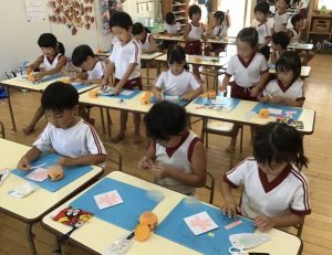 クレヨンで色を塗った後、シューッパシューッパを意識してハサミで切ることができました✨