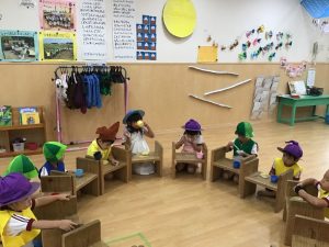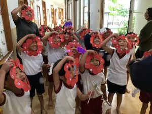 ひまわり1組さんはミャクミャクに変身!以前、お誕生日ペンダントを作った時にミャクミャクに見えたことから、「ミャクミャクになりたーい!」と決まったそうです😂