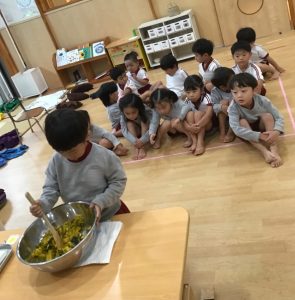 交代で材料をまぜまぜして、焼いて、皆でハロウィンパーティー!🎃「モチモチしてて美味しい〜!」と好評でした!