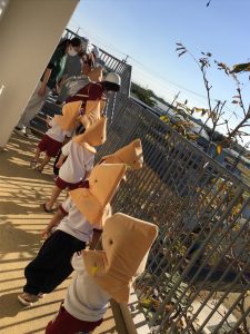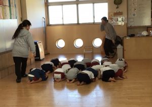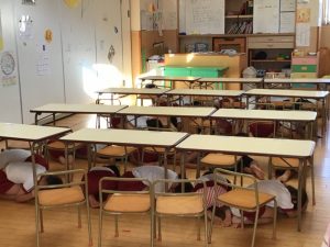 今日は災害訓練でした。訓練の放送が入るとすぐに集まって頭を守る子どもたち。机が出ていたクラスは机の下に入って頭を守ることができました。