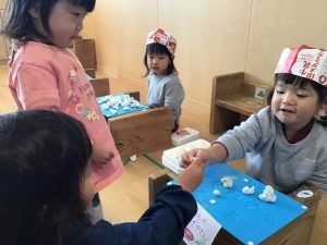 つぼみさんはん粘土で作ったものでお店屋さんをしました! 交代ばんこで売る側と買う側をしましたが、どちらもとても楽しそうでした✨