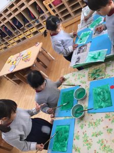 白いクレヨンで模様を描いておいた画用紙に、緑の絵の具を塗りました🎨