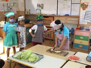 ひまわりさんは農園で取ってきた白菜を使ってお味噌汁作り!
