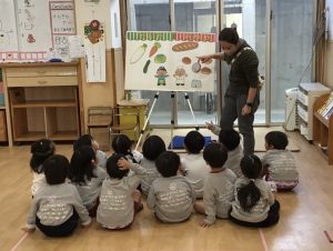 すみれさんはいろいろな楽器に触れたり、「やおやのお店」の歌のパネルシアターを楽しみました🎶
