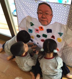 最近、ボタンをとめる練習をしているあさがおさん!写真は座光寺先生にお洋服を着せてあげている様子です☺️