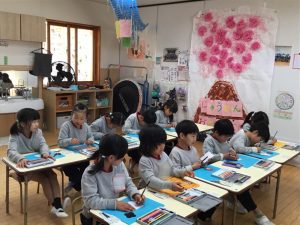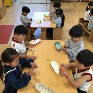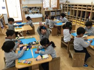 すみれさんは雛飾りの制作の続きをしたり、画用紙の穴に毛糸を通してツクシを作ったりしました!